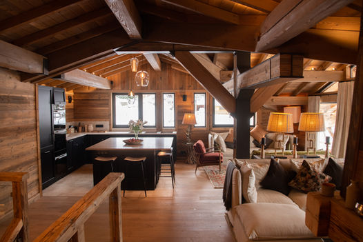 Follow the winding staircase upstairs to a warm, open plan living room, snug & cosy log fire. Our newly extended south-west facing balcony gives way to breathtaking views of the Chamonix valley, complete with benches and rugs for reading, sun-worshipping, or a slice of cake and a coffee after a long day's skiing.